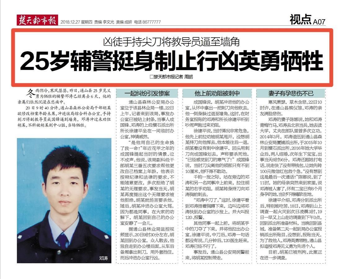 2018年12月27日,楚天都市報(bào)一篇《兇徒手持尖刀將教導(dǎo)員逼至墻角 25歲輔警挺身制止行兇英勇?tīng)奚返膱?bào)道對(duì)這一案件進(jìn)行了詳細(xì)披露,一時(shí)間也在互聯(lián)網(wǎng)上引發(fā)強(qiáng)烈反響。之所以引起廣泛關(guān)注,只因文中那個(gè)手持尖刀的兇手,不是一個(gè)普通歹徒,而是一名人民警察。