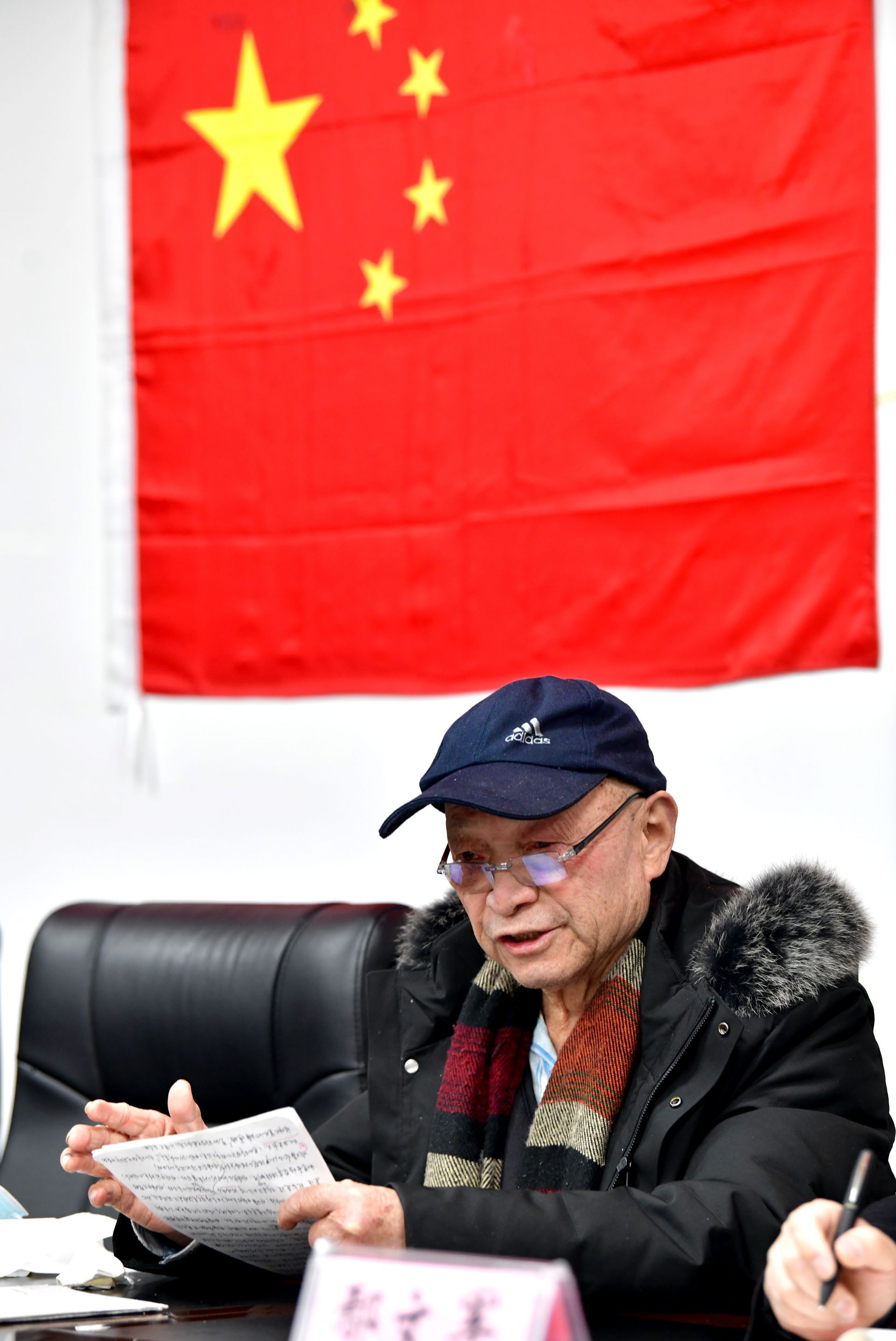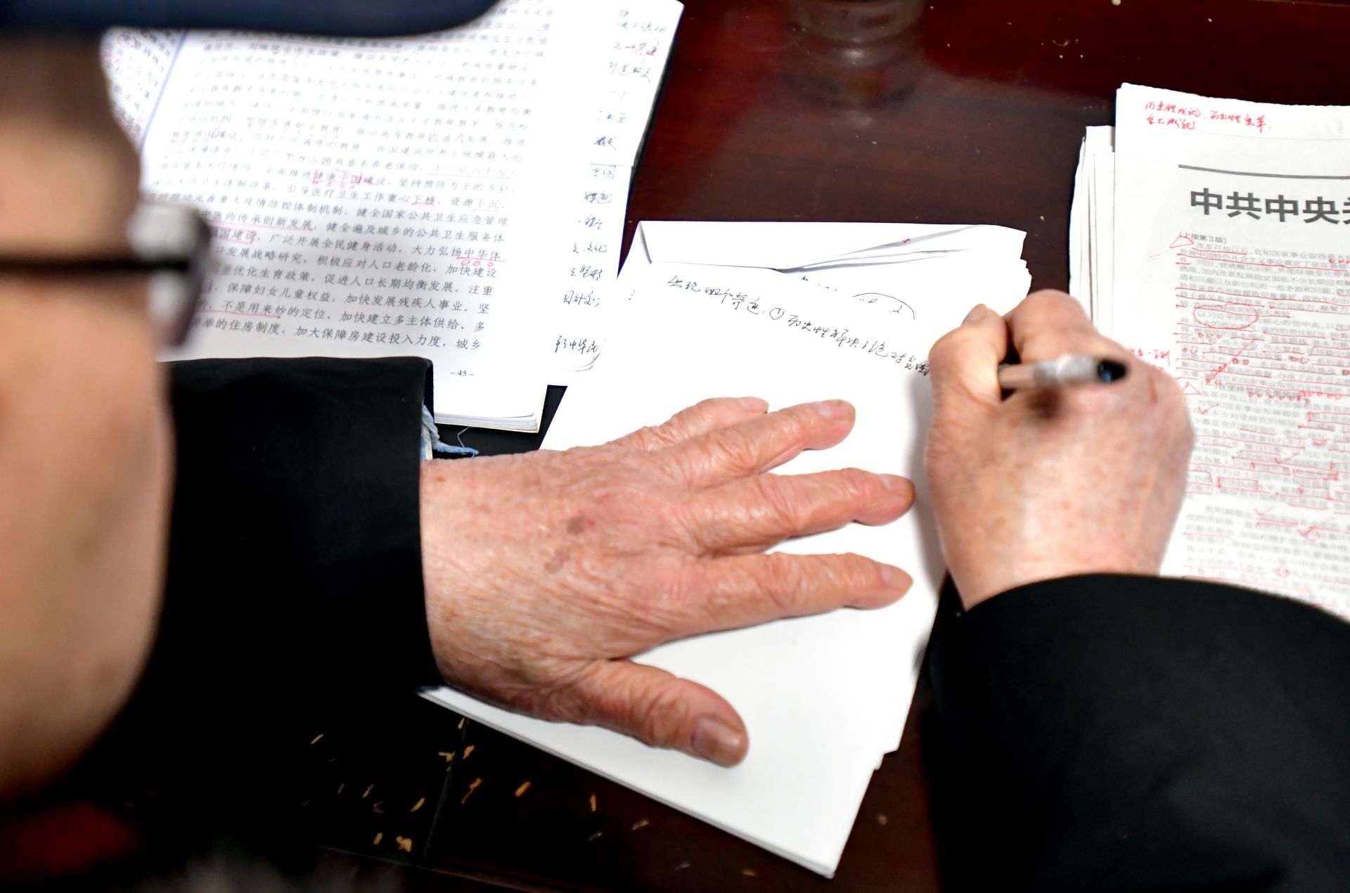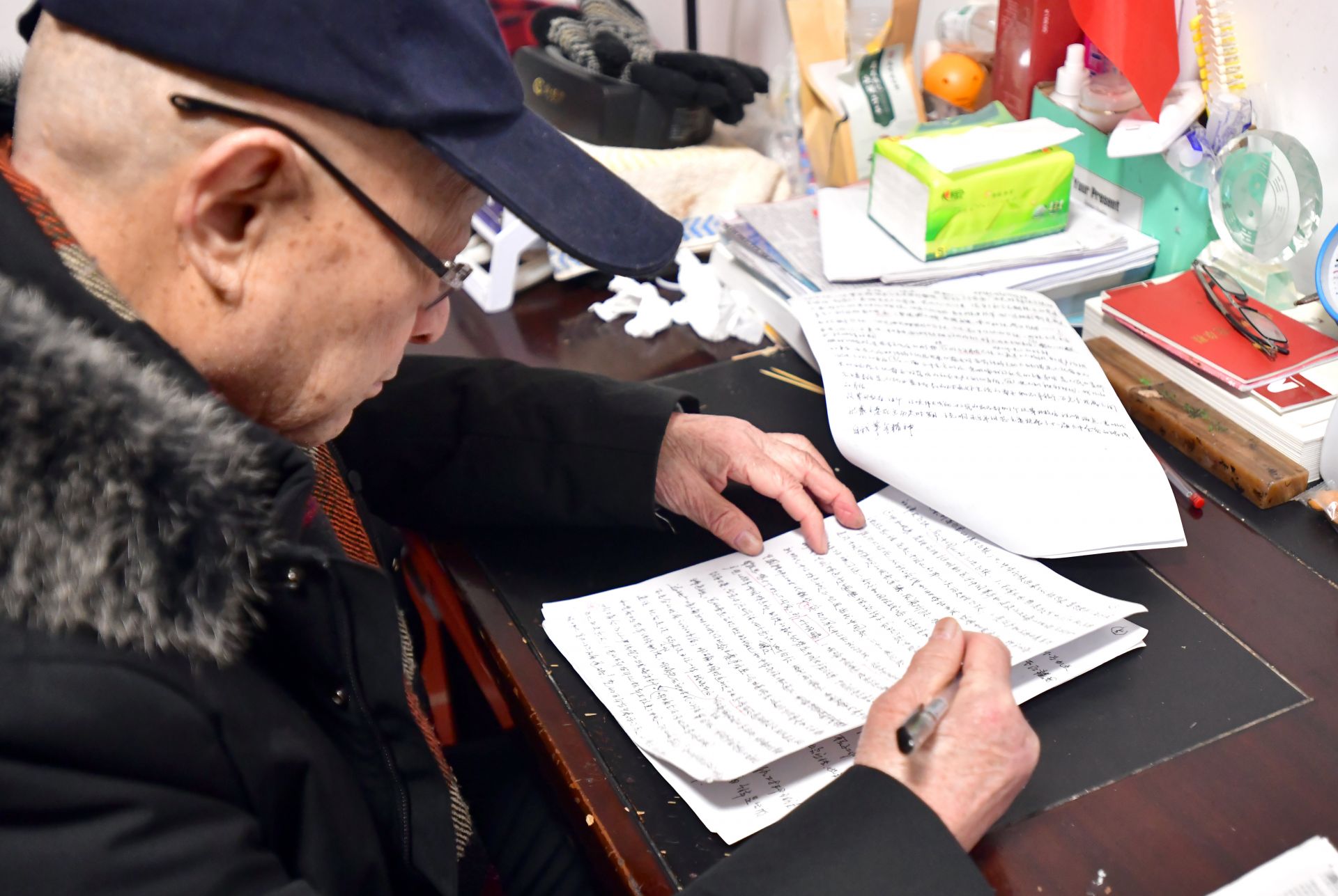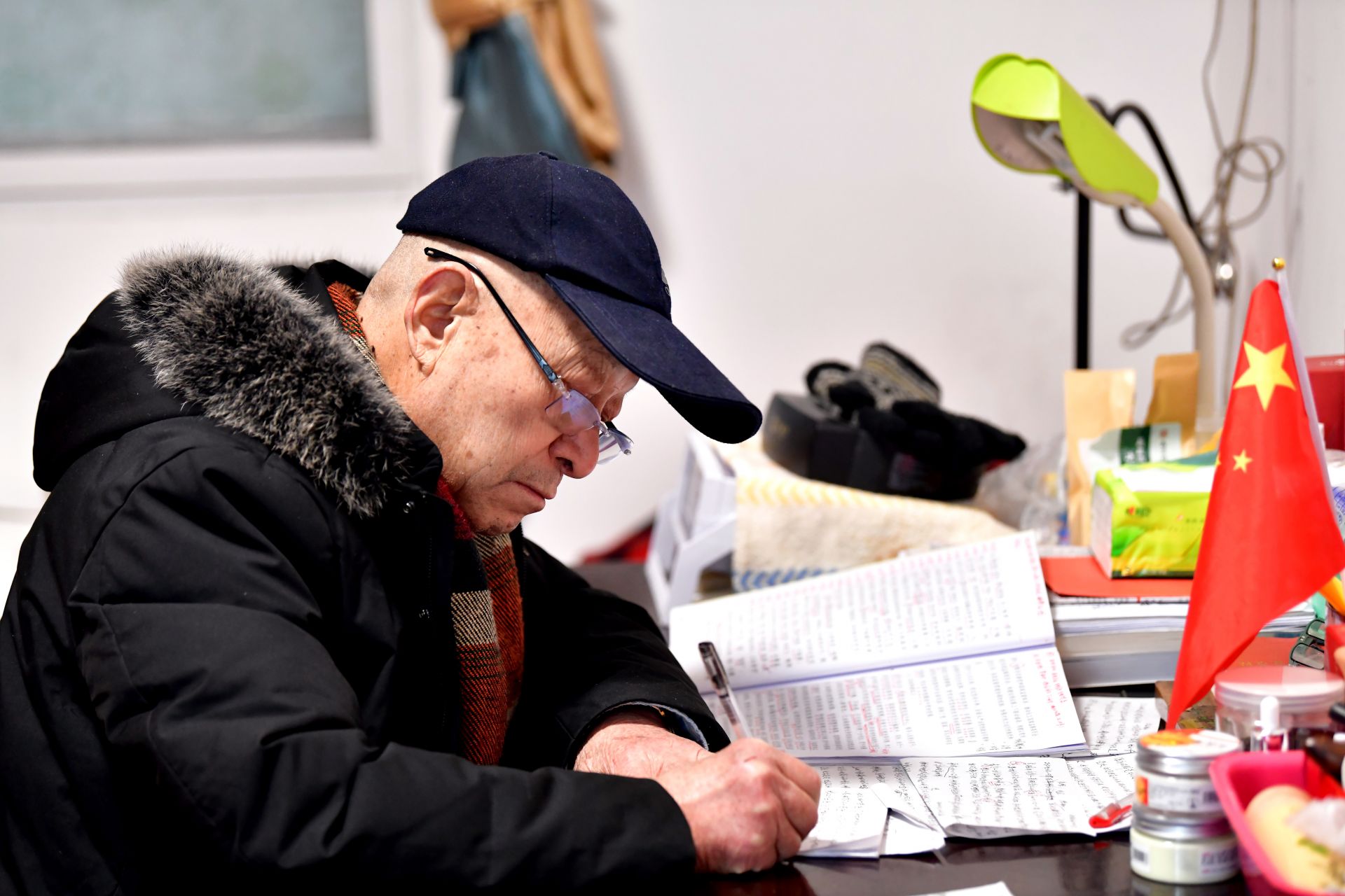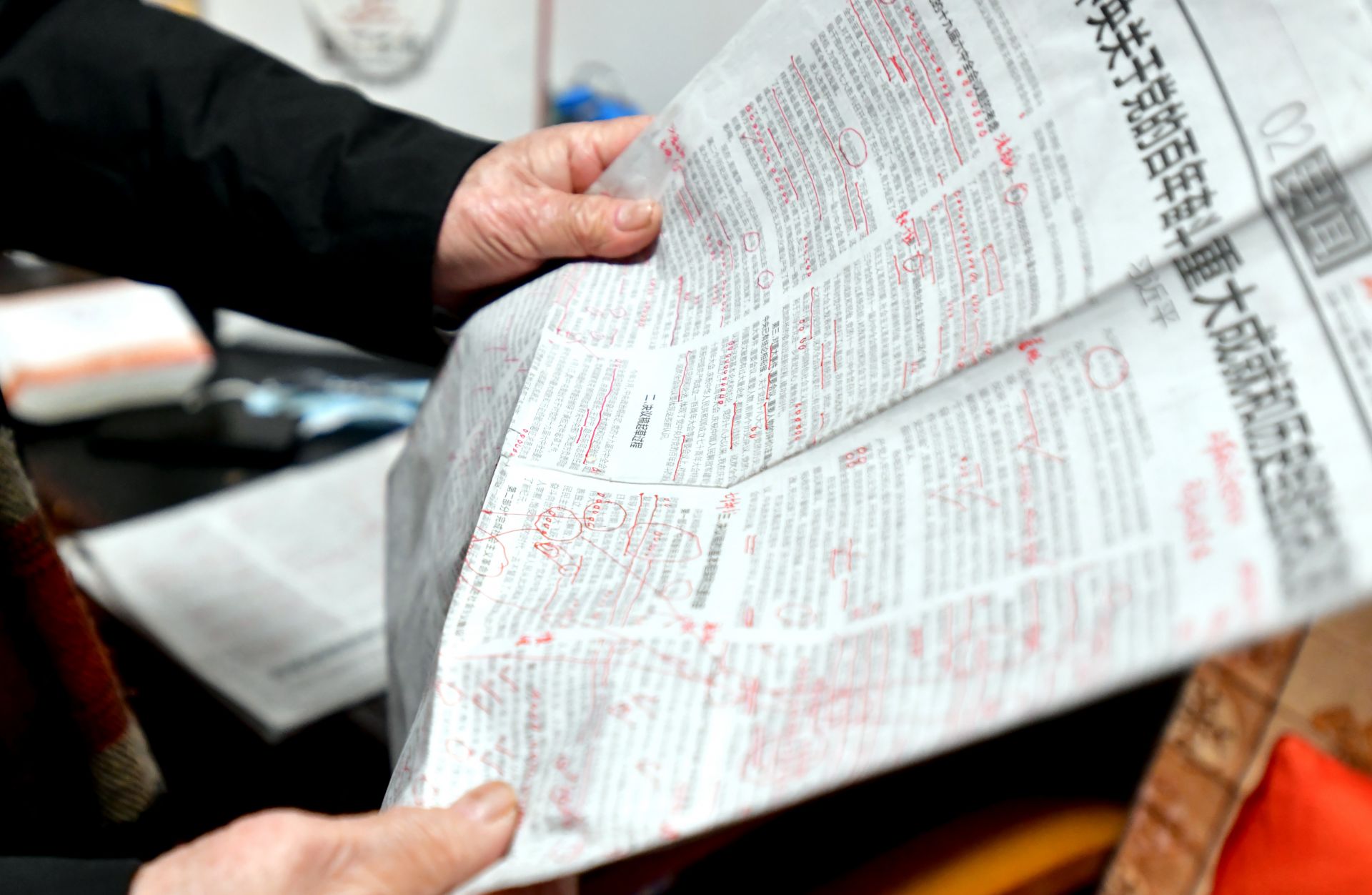 他的書桌上堆滿了厚厚的書籍,筆筒插著一面小國(guó)旗,面前攤開(kāi)的報(bào)紙上,紅色的標(biāo)注分外醒目。老人正一筆一劃、不疾不徐地做著筆記。