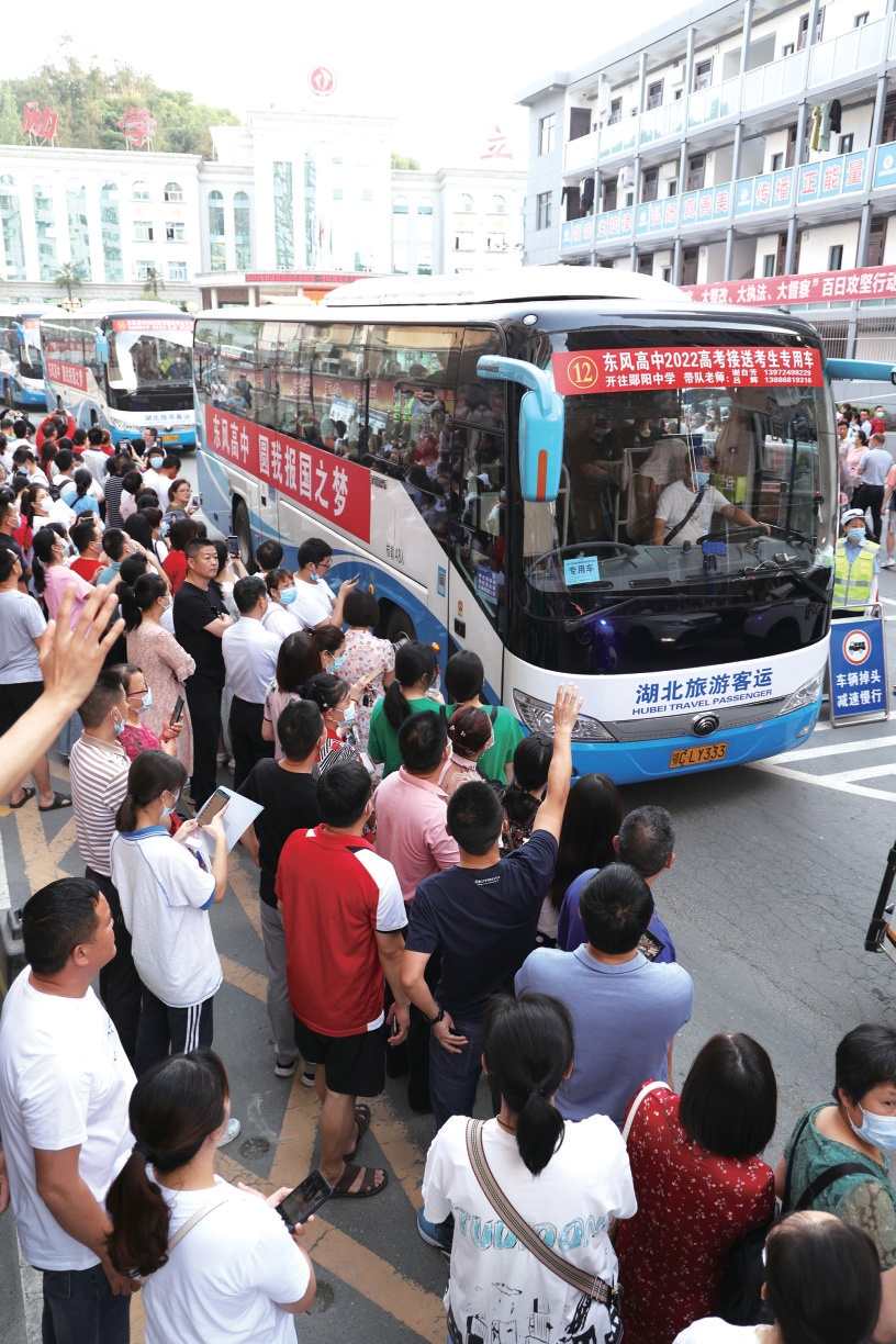東風高中的“少年戰(zhàn)士”踏上高考的征程。車身上的標語“圓我報國之夢”為孩子們的夢想做了最好注解。