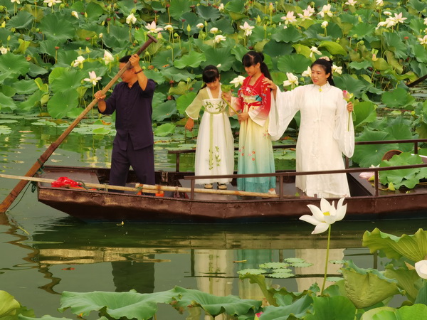 “武當(dāng)可采蓮,蓮葉何田田。”在武當(dāng)山太極湖濕地公園,百畝荷花競(jìng)相開(kāi)放,微風(fēng)輕拂,碧波蕩漾,花香四溢,為炎炎夏日增添了詩(shī)意。身著漢服的古琴師帶著兩名采蓮少女,泛著小舟,暢游在花海,采摘蓮子和荷葉,為即將制作的消夏納涼荷花茶、消暑湯做準(zhǔn)備,體驗(yàn)不一樣的大暑節(jié)氣,勾勒出一幅美妙的圖畫(huà)。