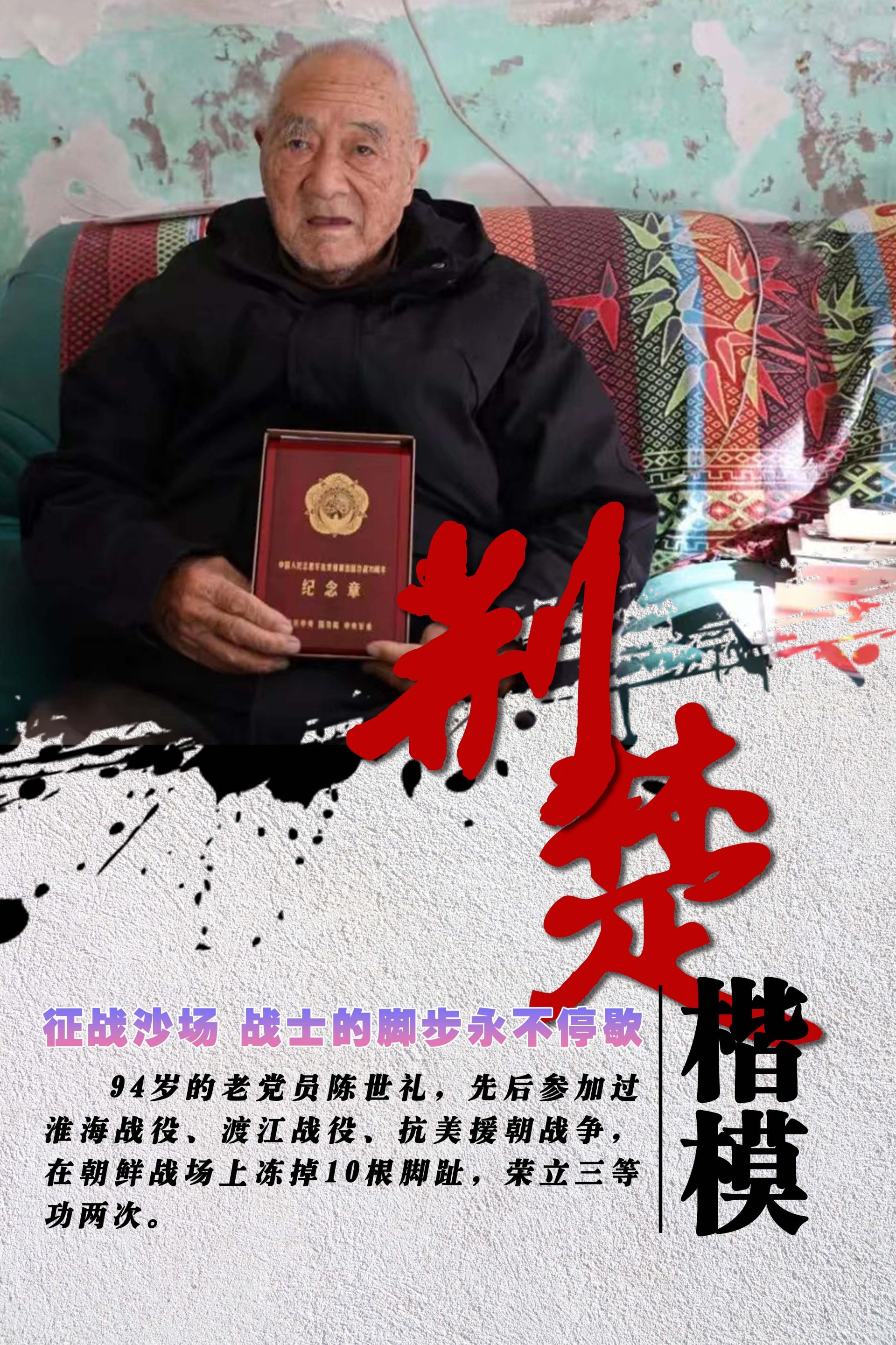 荊楚網(wǎng)(湖北日?qǐng)?bào)網(wǎng))訊(通訊員 殷霞)陳世禮,男,1928年5月生,中共黨員,原湖北省黃岡市黃州區(qū)面粉廠黨支部書(shū)記。他先后參加淮海戰(zhàn)役、渡江戰(zhàn)役、抗美援朝戰(zhàn)爭(zhēng),在朝鮮戰(zhàn)場(chǎng)上凍掉10根腳趾,兩次榮立三等功。1957年,陳世禮退役,主動(dòng)選擇回到家鄉(xiāng),在黃岡糧食系統(tǒng)工作數(shù)十年。70多年來(lái),他淡泊低調(diào),從不居功自傲、從不在人前顯耀。陳世禮曾榮獲“荊楚楷?!睒s譽(yù)。