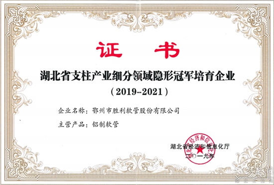 2019年,勝利軟管獲得湖北省支柱產(chǎn)業(yè)細分領(lǐng)域隱形冠軍培育企業(yè);2021年,勝利軟管獲得“湖北省高新技術(shù)企業(yè)”稱號;2022年,勝利軟管成功入圍湖北省第四批專精特新“小巨人”企業(yè)。