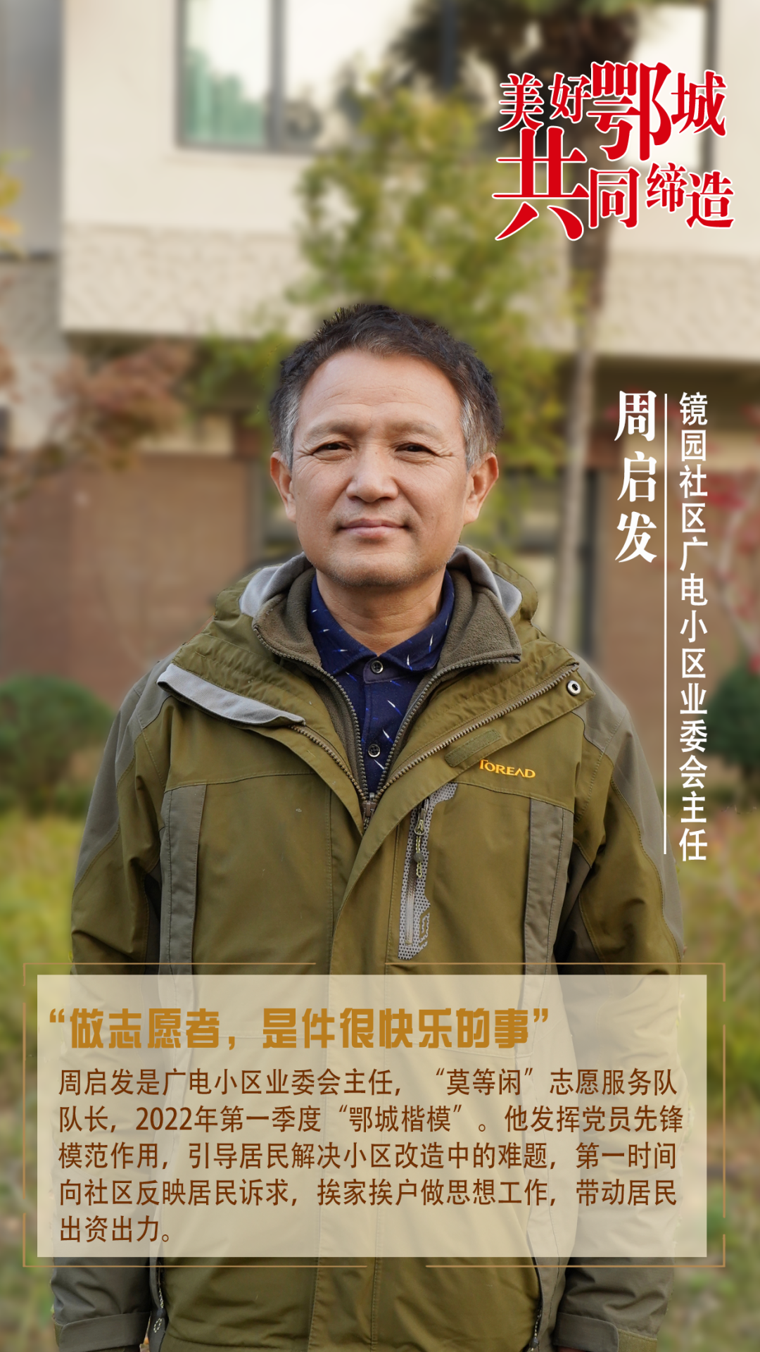 周啟發(fā)是廣電小區(qū)業(yè)委會(huì)主任,“莫等閑”志愿服務(wù)隊(duì)隊(duì)長(zhǎng),2022年第一季度“鄂城楷?!?。他發(fā)揮黨員先鋒模范作用,引導(dǎo)居民解決小區(qū)改造中的難題,第一時(shí)間向社區(qū)反映居民訴求,挨家挨戶做思想工作,帶動(dòng)居民出資出力。
