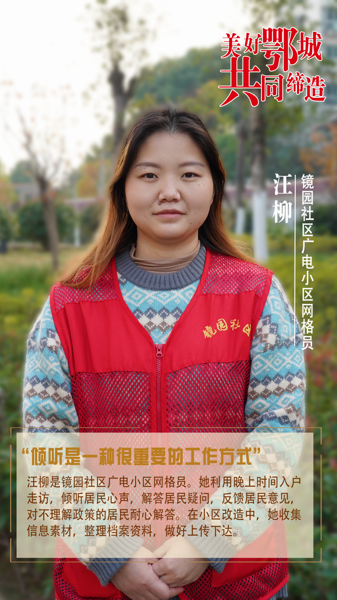 汪柳是鏡園社區(qū)廣電小區(qū)網(wǎng)格員。她利用晚上時(shí)間入戶走訪,傾聽(tīng)居民心聲,解答居民疑問(wèn),反饋居民意見(jiàn),對(duì)不理解政策的居民耐心解答。在小區(qū)改造中,她收集信息素材,整理檔案資料,做好上傳下達(dá)。