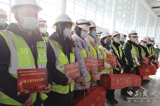 在鄂州花湖機場航站樓一樓大廳,現(xiàn)場氣氛熱烈,上午9時,鄂州市總工會為乘機返鄉(xiāng)的首批60名建設(shè)者代表贈送飛機票和年貨禮包,讓春節(jié)回家路更加溫暖、舒心、便捷。