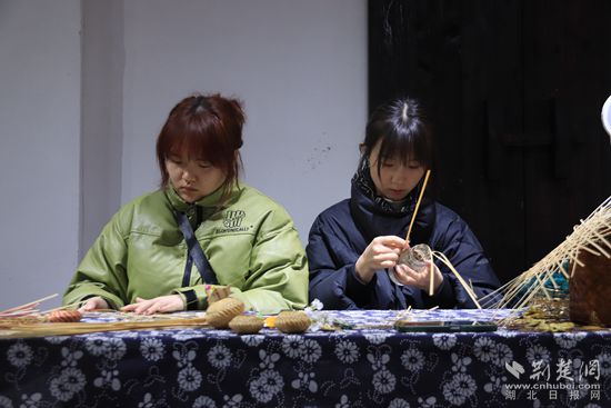 在演出現(xiàn)場(chǎng)旁的鄉(xiāng)村記憶館內(nèi),馬橋油畫風(fēng)景寫生展、鄂南雕花剪紙作品展同時(shí)吸引著游人的目光。來(lái)自湖北科技學(xué)院的學(xué)生正在展廳中編織特色竹制品,繪制富有當(dāng)?shù)孛袼滋攸c(diǎn)的文創(chuàng)作品。