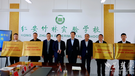 湖北省體育局洪山體育中心少兒體校與紅安縣文化和旅游局、紅安縣教育局簽訂合作協(xié)議。湖北省體育局洪山體育中心主任馮金榮分別向紅安縣第二中學、紅安縣竹林實驗學校、紅安縣明易體育文化傳播有限公司、黃岡市斯博特體育發(fā)展有限公司授予“湖北省體育局洪山體育中心少兒體育籃球、羽毛球訓練基地”牌匾。
