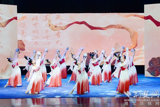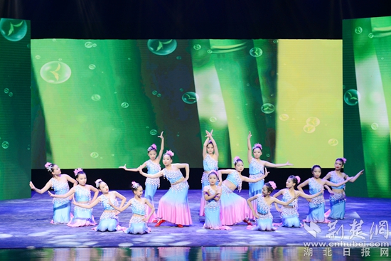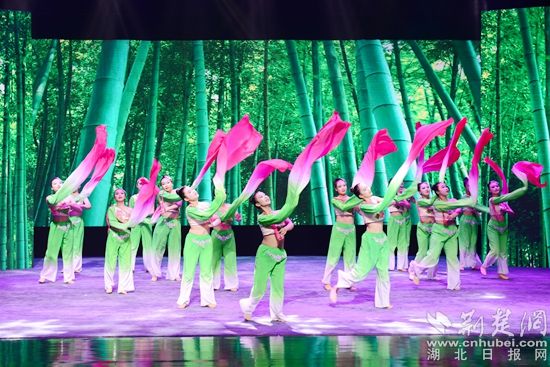 舞蹈《且吟春雨》《看了你一眼》婀娜曼妙,韻味十足。舞蹈《把愛寄回家》纏綿婉轉(zhuǎn),真情再現(xiàn)了一群留守兒童收到父母的快遞,思念父母的情景,表達(dá)留守兒童的心聲和期盼,呼吁社會(huì)給予他們更多的關(guān)愛。舞蹈《楚鼓聲聲》鏗鏘有力,再現(xiàn)了泱泱大國(guó)威武雄風(fēng)。