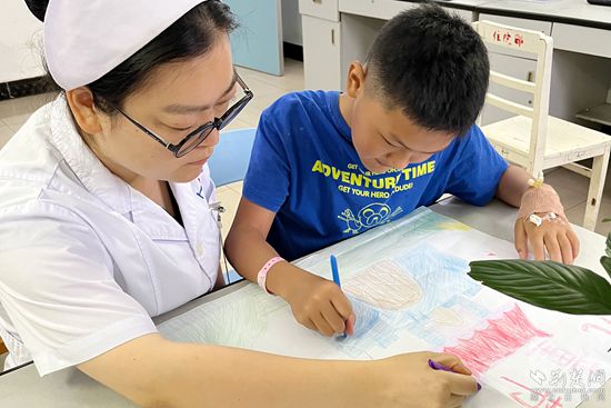 “這幅畫送給黃醫(yī)生?!毙∶饕驗橹夤苎捉邮芰艘恢艿淖≡褐委煟趦嚎撇》績?nèi)用顏料、紙張和畫筆,畫了自己和兒科主任黃佳林主任的合照,準(zhǔn)備在出院時送給醫(yī)生。