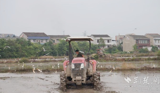 水田中,打田機(jī)來回穿梭,工人們在忙著灌水、播種,到處都是一片生機(jī)勃勃的繁忙景象。一群群白鷺鳥在人與機(jī)器之間飛來飛去嬉耍,織就出一幅喜樂祥和的圖畫。