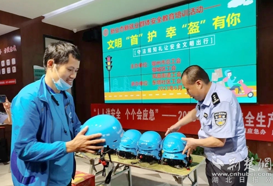 隨后趙警官和社區(qū)志愿者為“藍(lán)騎士”們贈送頭盔和愛心防暑飲品,把工會組織對新業(yè)態(tài)新就業(yè)群體的濃濃關(guān)愛送到小哥們心間,倡導(dǎo)大家在忙碌的送餐服務(wù)中一定要做到“文明騎行,安全配送”,爭當(dāng)文明交通的維護(hù)者、示范者、宣傳者和引導(dǎo)者,用實(shí)際行動為城市文明增光添彩。
