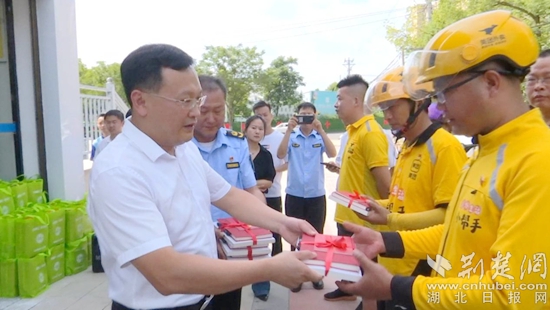 儀式上,紅安縣委常委、組織部部長(zhǎng)余宏波向外賣騎手代表贈(zèng)送黨的二十大精神學(xué)習(xí)資料及愛心物資。
