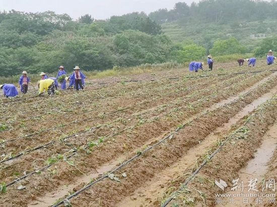 荊楚網(wǎng)(湖北日報網(wǎng))訊(通訊員毛紅平)6月25日,天空下著蒙蒙細雨,紅安縣永佳河鎮(zhèn)沙河村帥家河塆河畈地1000畝連片基地上,150多位村民正穿著雨衣,飛快地搶栽紅苕苗。