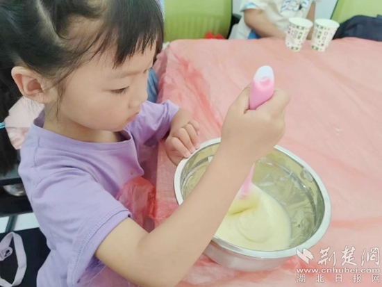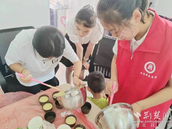 荊楚網(wǎng)(湖北日報(bào)網(wǎng))訊(記者陶輝 通訊員 黃知樂 馮鶴林 李佳佳)7月10日,記者來到黃州區(qū)路口社區(qū)暑期社會實(shí)踐點(diǎn),遠(yuǎn)遠(yuǎn)地就聞濃郁的香味。青春黃師服務(wù)隊(duì)熠夢小隊(duì)的志愿者們正和小朋友們一起制作蛋糕,現(xiàn)場其樂融融、歡聲笑語此起彼伏。