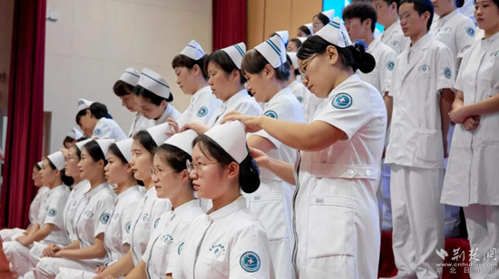 在激昂的黃岡市中心醫(yī)院院歌中,專家前輩和護(hù)士長代表為新職工們佩戴聽診器和燕尾帽,并一起重溫了中國醫(yī)師宣言和南丁格爾誓詞。新職工們肅然站立、莊嚴(yán)宣誓,鏗鏘有力的誓言久久回蕩。一張張青春洋溢的臉龐,一聲聲莊嚴(yán)的承諾,都詮釋著投身醫(yī)療事業(yè)的無限榮光。