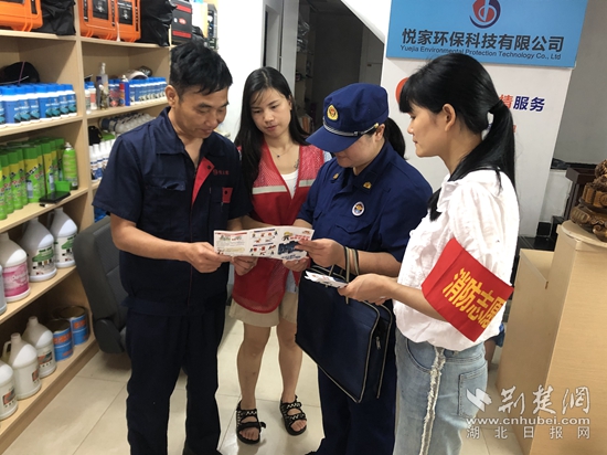 在西塞山區(qū),消防人員走進沿街門面開展消防安全檢查宣傳?!疤鞖庋谉?,用電量劇增,請不要私拉亂接線路、超負荷用電,要經(jīng)常檢查線路敷設是否完好?!毕廊藛T一邊檢查,一邊提醒商戶要經(jīng)常開展消防隱患自查自改,同時要熟練掌握滅火器、消火栓等器材使用方法。下陸區(qū)消防救援大隊結合夏季高溫防火特點,整合戶外大屏、社會單位LED屏幕等社會資源循環(huán)播放夏季防火提示公告、高溫防火提示,提醒廣大人民群眾規(guī)范用火、用氣、用電。