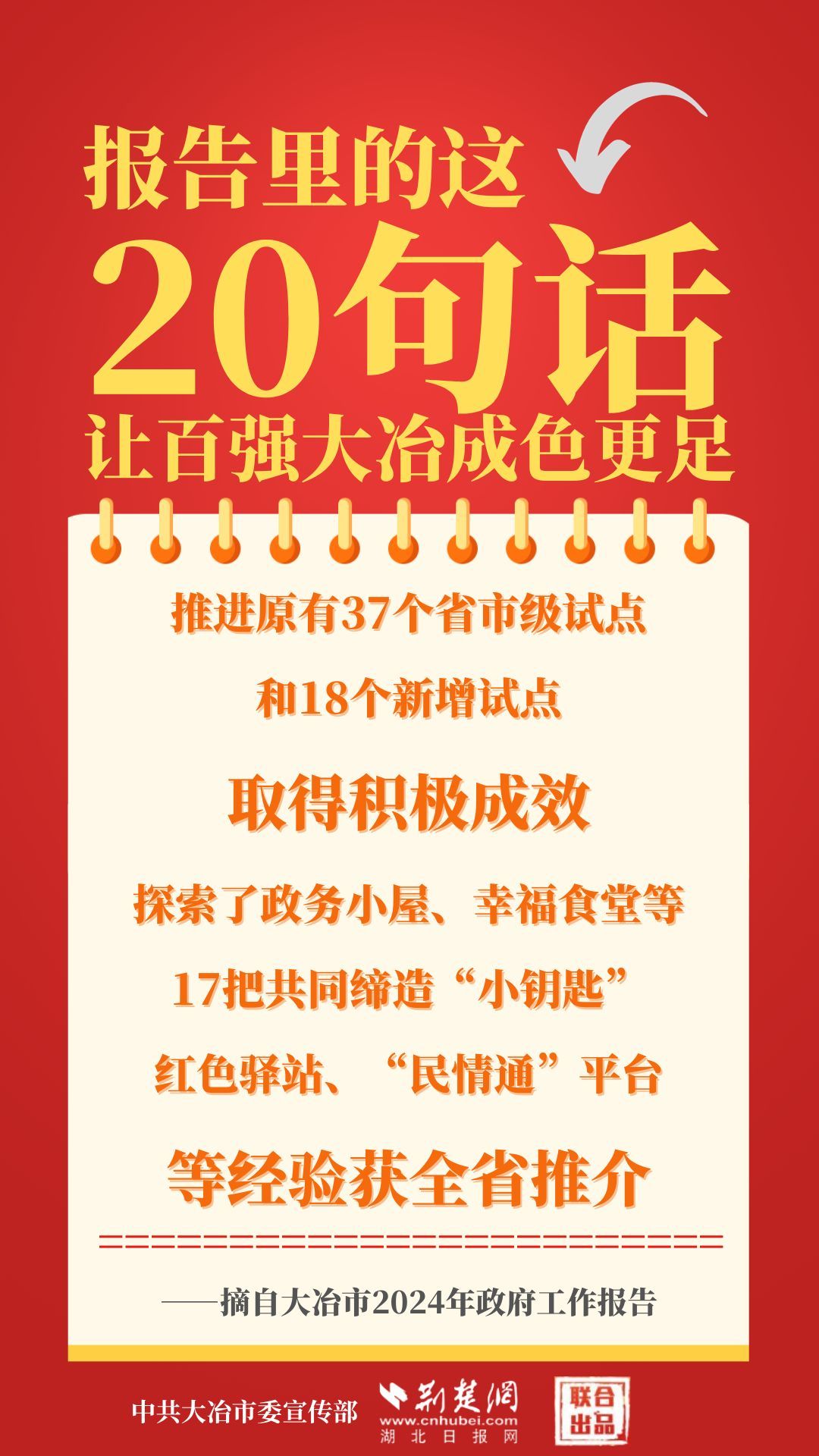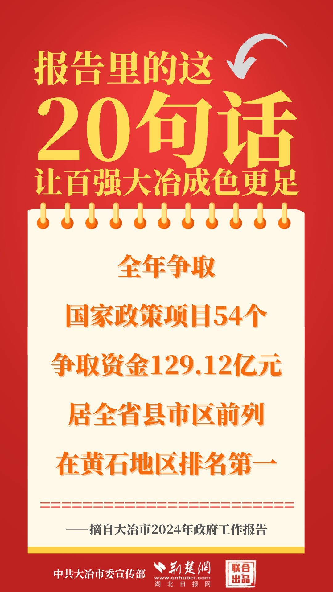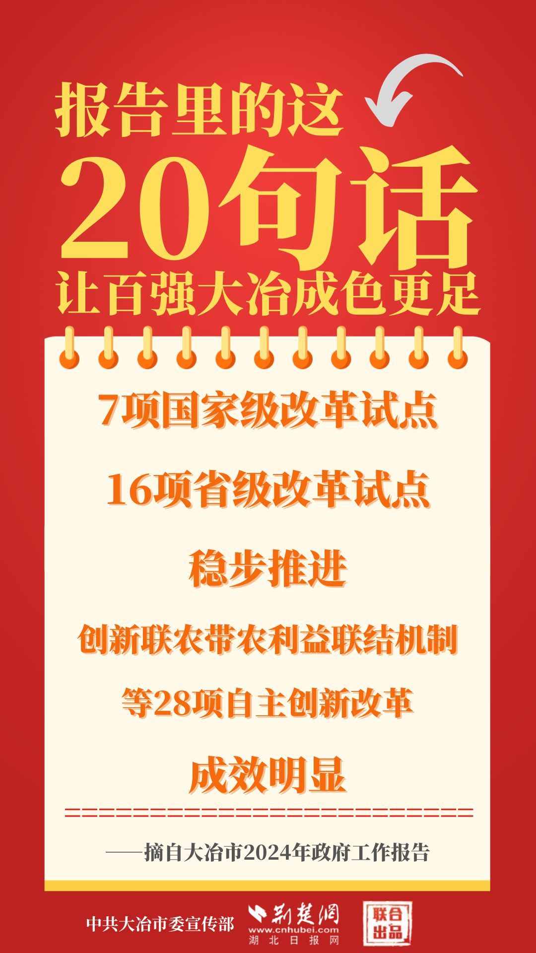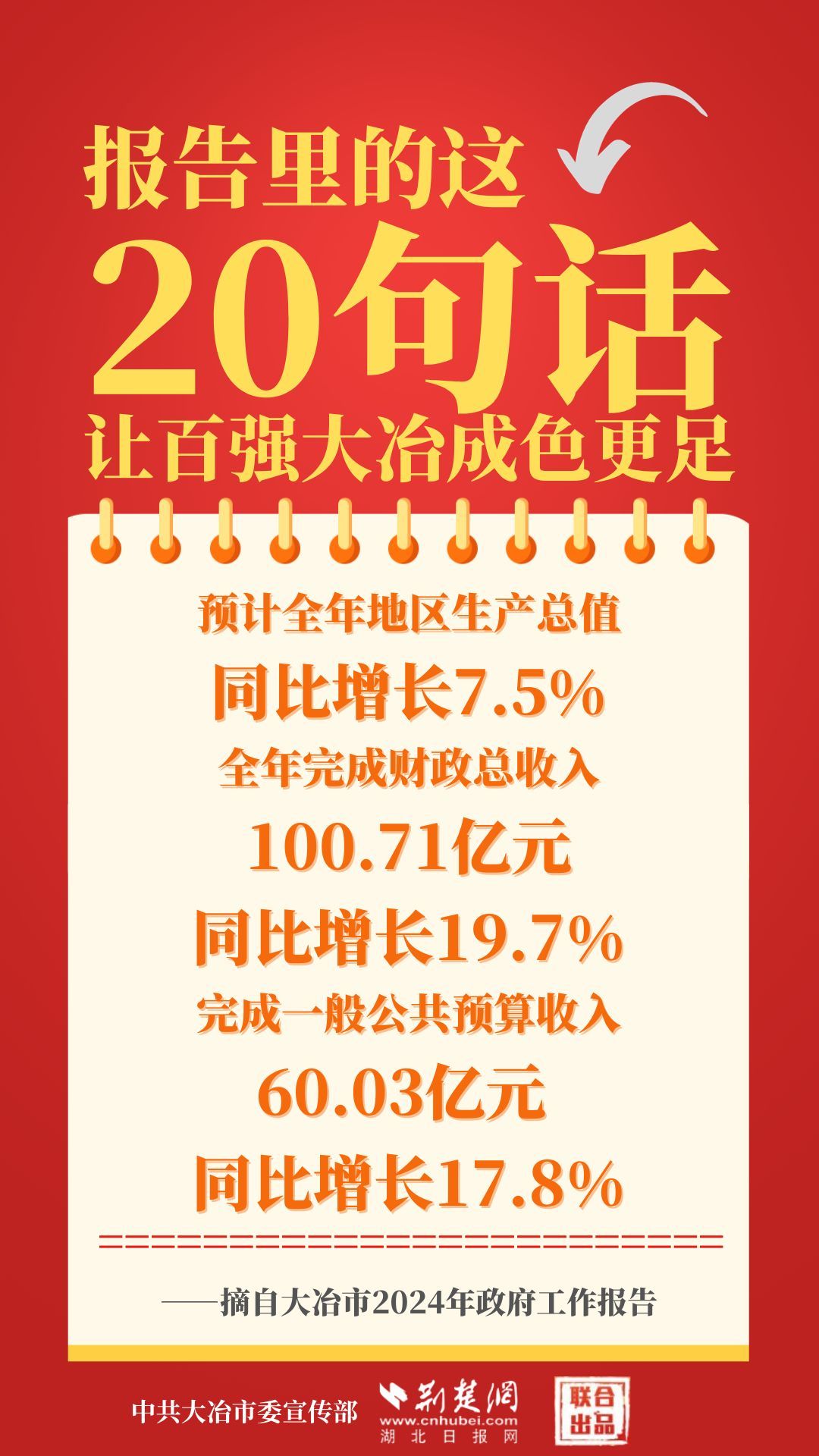 1月12日,大冶市第七屆人民代表大會第四次會議開幕,大冶市委副書記、市長孫輒作政府工作報告。報告里的這20句話,讓百強大冶成色更足。