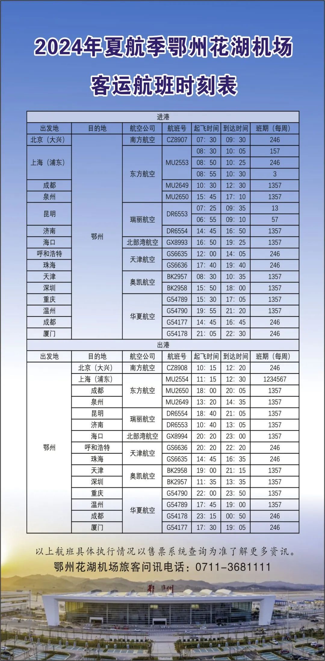 華夏航空新開成都—鄂州—廈門航線。去程:成都14:45—16:45鄂州,鄂州17:30—19:05廈門;回程:廈門21:05—22:30鄂州,鄂州23:15—00:50成都(+1)。具體執(zhí)飛信息以航空公司實際執(zhí)行為準(zhǔn)。