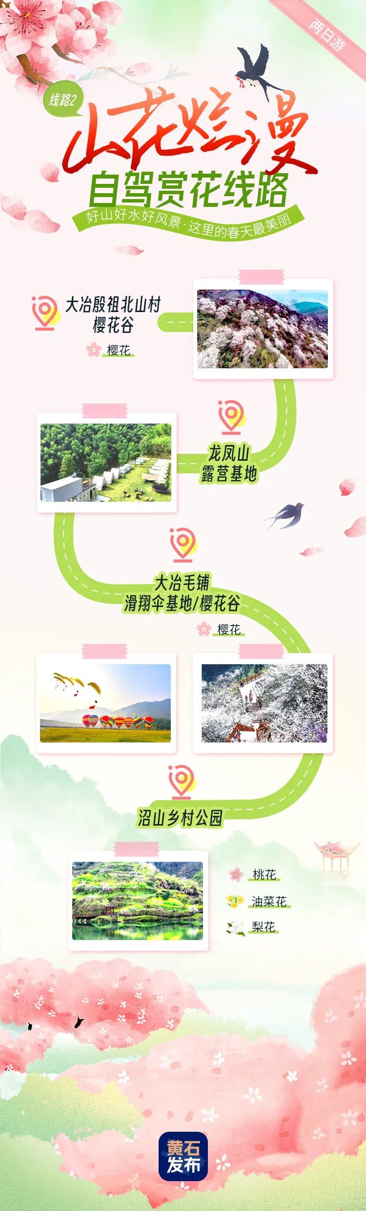 大冶殷祖北山村櫻花谷-龍鳳山露營基地-大冶毛鋪滑翔傘基地/櫻花谷-沼山鄉(xiāng)村公園。