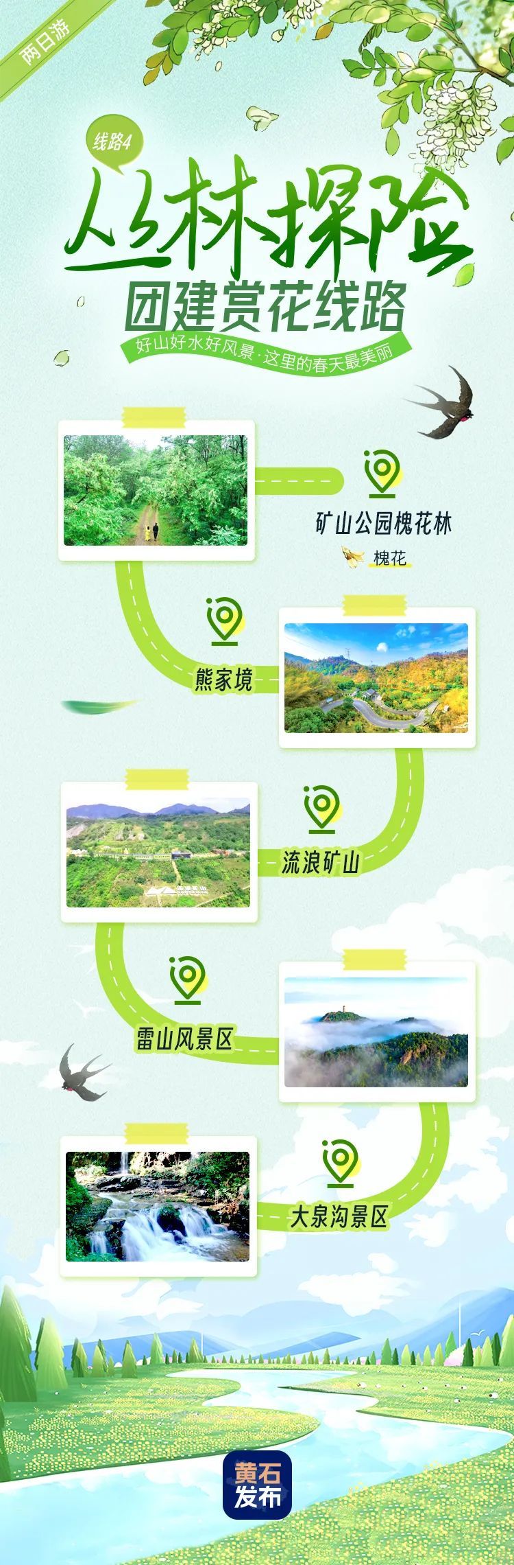 礦山公園槐花林-熊家境-流浪礦山-雷山風(fēng)景區(qū)-大泉溝景區(qū)。