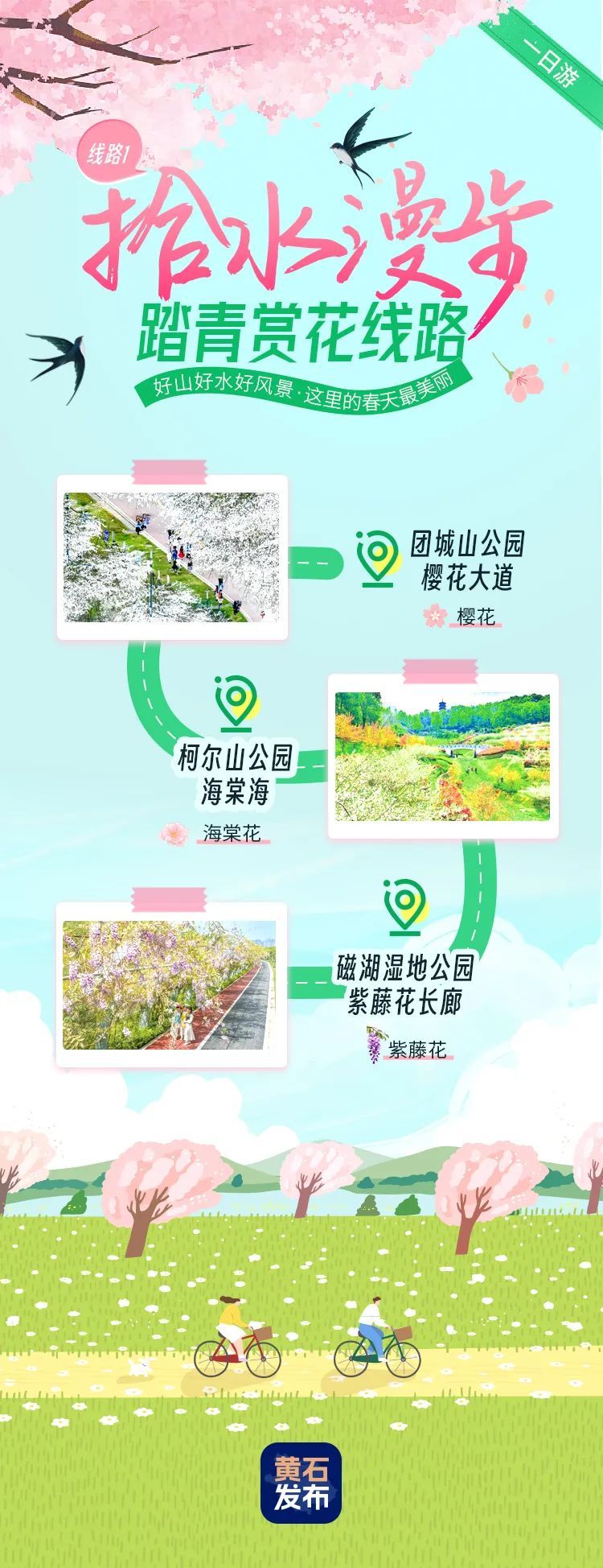 團(tuán)城山公園櫻花大道-柯爾山公園海棠海-磁湖濕地公園紫藤花長廊