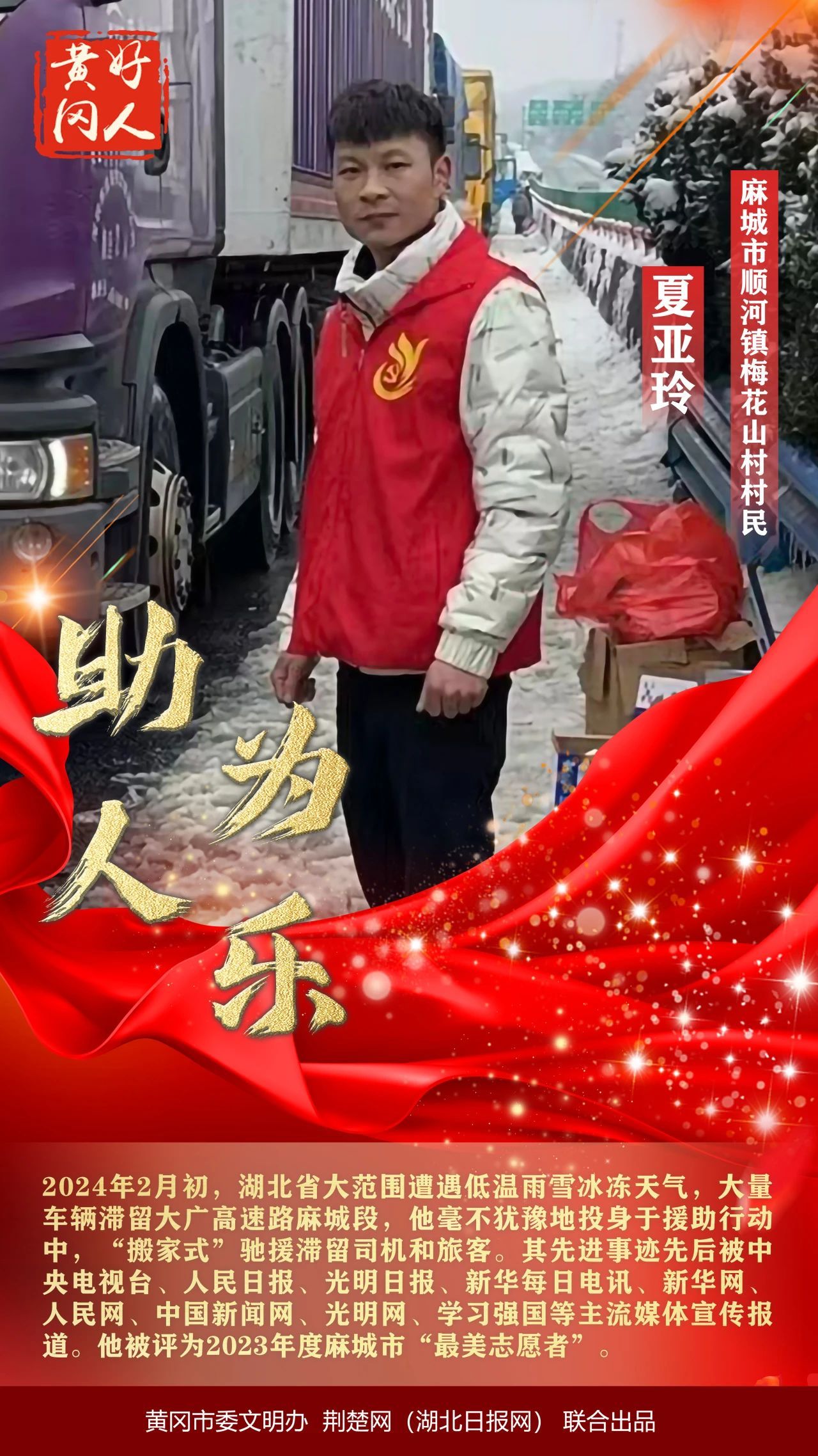 本期“黃岡好人”共有5組好人入選。他們中有風(fēng)雪中“搬家式”馳援滯留司機(jī)和旅客的夏亞玲;有返鄉(xiāng)創(chuàng)業(yè)助力鄉(xiāng)村振興,帶領(lǐng)村民共同致富的楊敬宇;有緊急時(shí)刻救助落水兒童的宋利華;有生死時(shí)速,徒手破車窗的民警黎剛;有27年無微不至照顧患病妻子的尤國才。