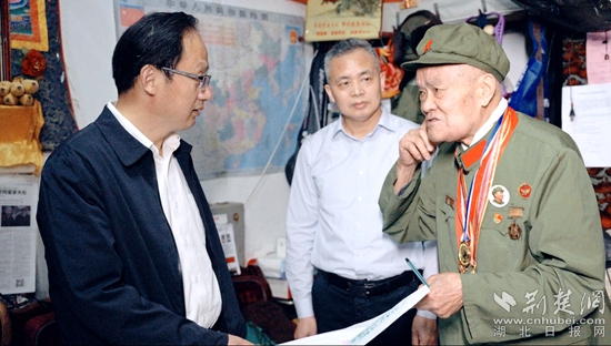 當(dāng)天上午,黃石市委宣傳部副部長、市委網(wǎng)信辦主任萬金光,黃石市退役軍人事務(wù)局黨組書記、局長陳鵬圖一行參加啟動(dòng)儀式,并前往抗美援朝老戰(zhàn)士瞿介昌住處看望。他們向瞿介昌老戰(zhàn)士簡(jiǎn)單介紹了本次主題報(bào)道情況,向這位老英雄獻(xiàn)上了鮮花,表達(dá)了對(duì)退役軍人的敬意,并為“致敬英雄”采訪團(tuán)授旗。