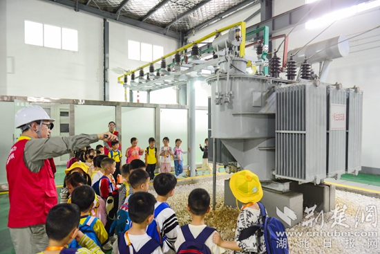 電力工作人員帶領(lǐng)小朋友們實(shí)地參觀展區(qū),學(xué)習(xí)電力知識。通訊員 供圖