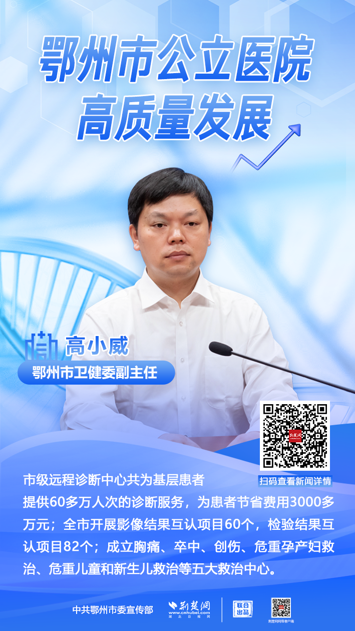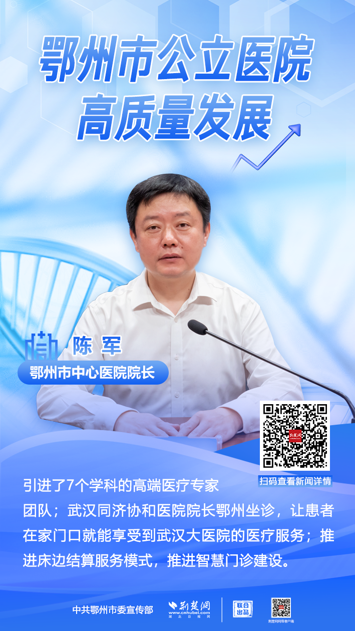 荊楚網(wǎng)(湖北日報(bào)網(wǎng))訊(記者 王焱堯 姜夢瑤)8月8日,鄂州市舉辦公立醫(yī)院高質(zhì)量發(fā)展新聞發(fā)布會,通報(bào)近年來該市在“推進(jìn)衛(wèi)生健康事業(yè)高質(zhì)量發(fā)展”中,公立醫(yī)院發(fā)展取得的系列成績。