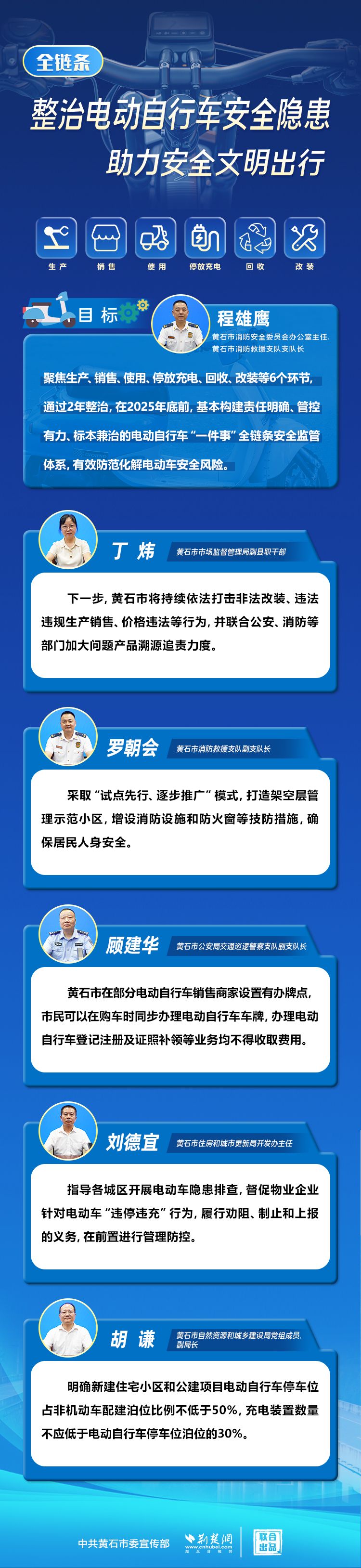 荊楚網(wǎng)(湖北日?qǐng)?bào)網(wǎng))訊(記者 劉璐 通訊員 李玉)8月15日,黃石召開(kāi)新聞發(fā)布會(huì),通報(bào)全市電動(dòng)自行車安全隱患全鏈條整治行動(dòng)總體情況。會(huì)上提出,在2025年底前,基本構(gòu)建責(zé)任明確、管控有力、標(biāo)本兼治的電動(dòng)自行車“一件事”全鏈條安全監(jiān)管體系。