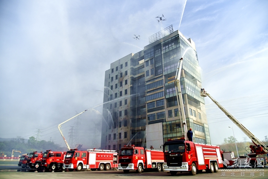 在滅火救援過(guò)程中,黃石消防首次設(shè)置無(wú)人機(jī)滅火科目,配合云梯車(chē)人員疏散、火場(chǎng)緊急避險(xiǎn)、高層供水、內(nèi)部攻堅(jiān)等實(shí)戰(zhàn)化內(nèi)容,向參會(huì)人員展示了黃石市消防救援隊(duì)伍建設(shè)成效。