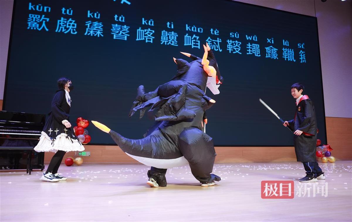 704班學(xué)生演了一出《達(dá)拉崩吧》話劇,騎士、公主、國王、恐龍、馬的服裝是他們定的,炫酷搞笑的視頻布景也是他們做的。“我從小玩編程,這個(gè)還好啦,演恐龍的寇樂芊也有幫我剪視頻?!逼渲猩砑鎸?dǎo)演、舞美設(shè)計(jì)、騎士扮演者三職的劉致銘說?!拔野嗪⒆友荨妒刈o(hù)之光》小品,就找劇本我?guī)土它c(diǎn)忙,其他都是他們自己安排。上周五全校彩排我第一次看完全劇,發(fā)現(xiàn)他們好有創(chuàng)意,好會(huì)演?!?05班班主任徐怡楠驕傲地說,每次活動(dòng)都發(fā)現(xiàn)許多學(xué)生的閃光點(diǎn),正如“走過冬天”藝術(shù)節(jié)的slogan(口號)所說,在活動(dòng)中,青春多了一份厚實(shí),人生多了一份財(cái)富。