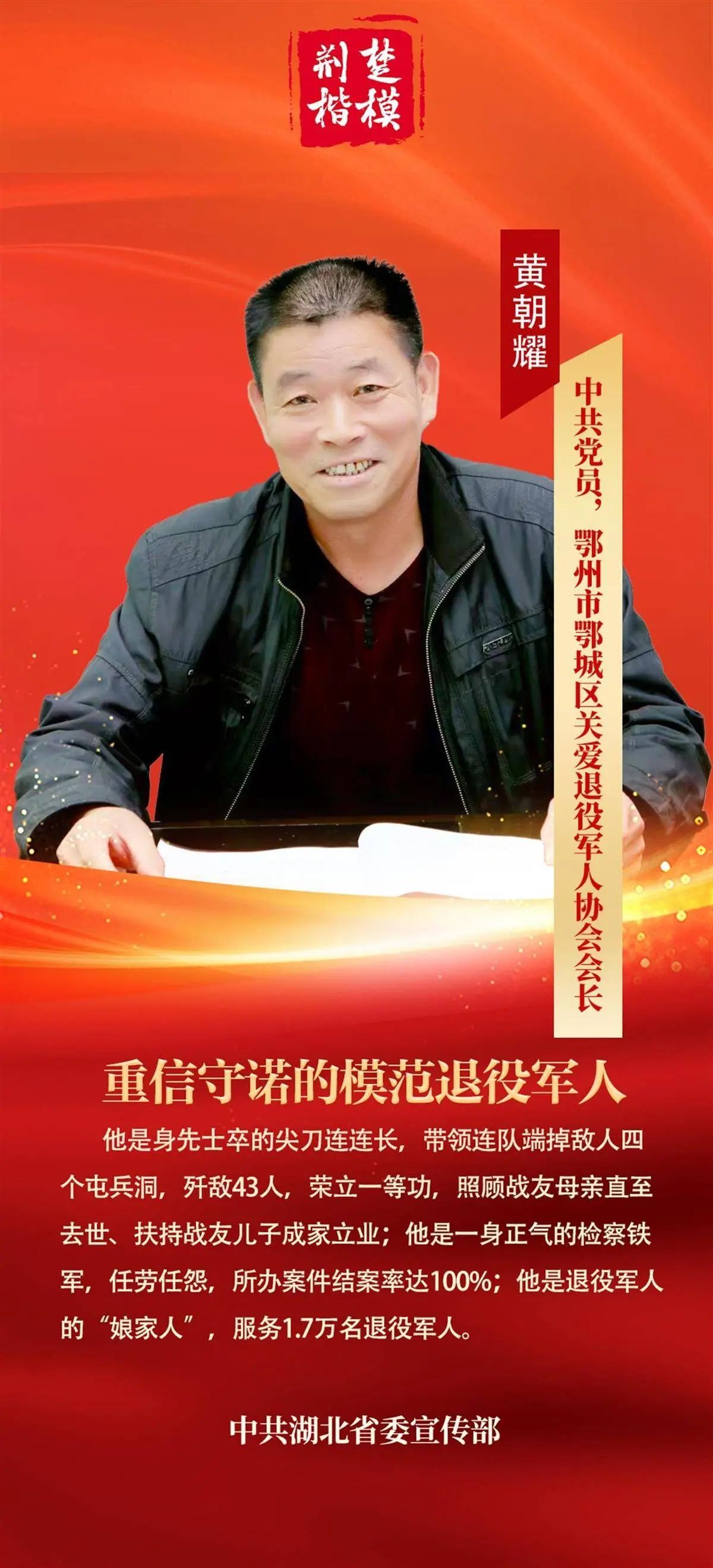 “荊楚楷?!标P(guān)于黃朝耀的頒獎(jiǎng)詞為:他是身先士卒的尖刀連連長(zhǎng),帶領(lǐng)連隊(duì)端掉敵人四個(gè)屯兵洞,殲敵43人,榮立一等功,照顧戰(zhàn)友母親直至去世、扶持戰(zhàn)友兒子成家立業(yè);他是一身正氣的檢察鐵軍,任勞任怨,所辦案件結(jié)案率達(dá)100%;他是退役軍人的“娘家人”,服務(wù)1.7萬(wàn)名退役軍人。2024年,他榮獲“全國(guó)模范退役軍人”榮譽(yù)稱號(hào)。