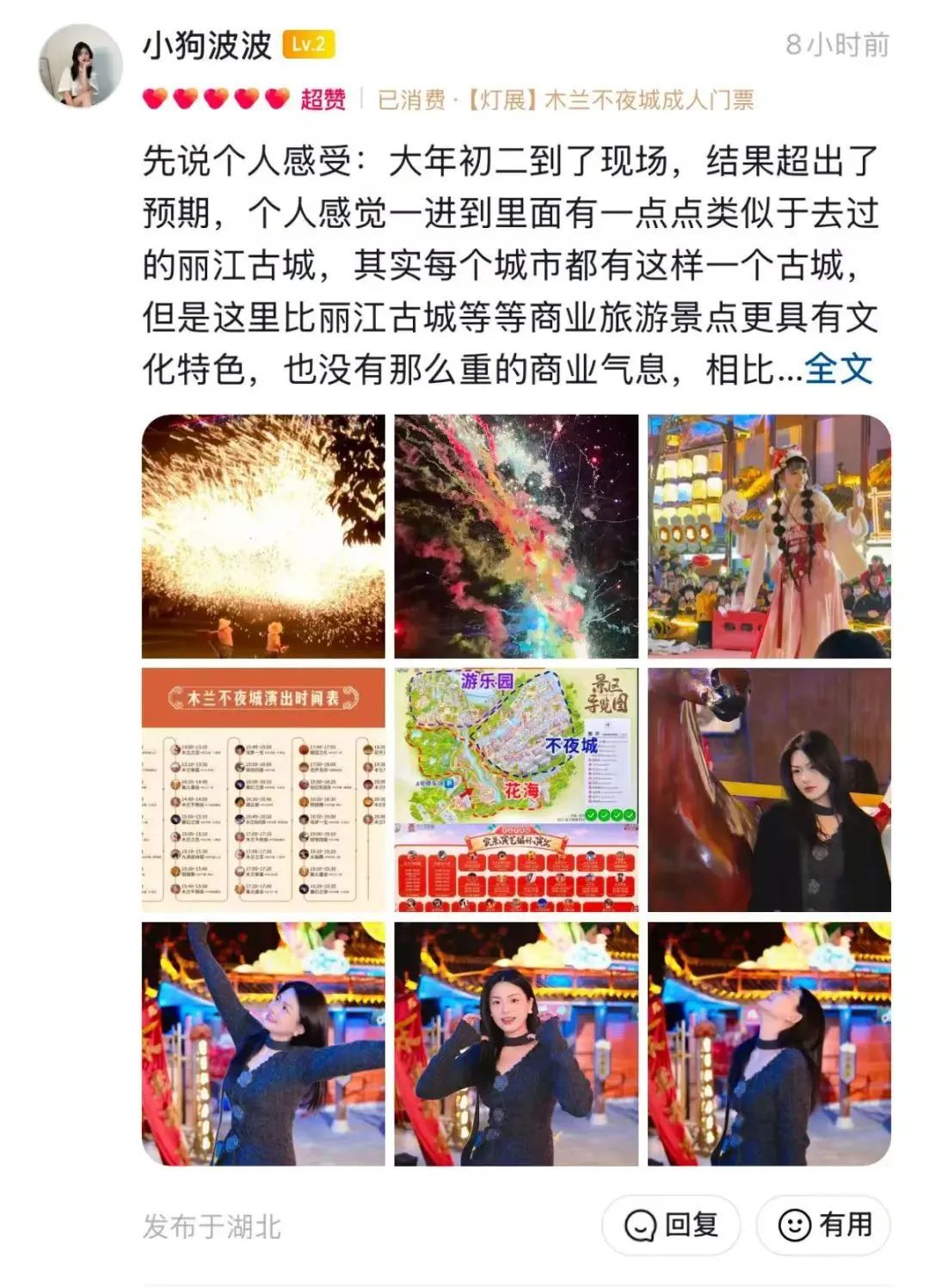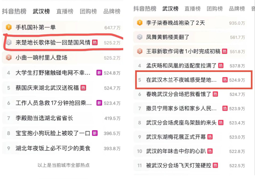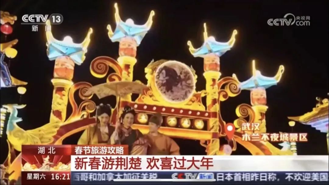 2月1日,央視新聞直播間欄目以《新春游荊楚,歡喜過大年》為題,聚焦湖北武漢鄉(xiāng)村游。解說詞說道:“武漢木蘭不夜城景區(qū),是以沉浸式夜游和木蘭文化實(shí)景演出為特色的旅游景區(qū)。春節(jié)假期,除了賞燈會、看民俗,木蘭不夜城全新打造的沉浸式劇場《楚地長歌》,為游客帶來更多元化的沉浸式打卡體驗(yàn)”。