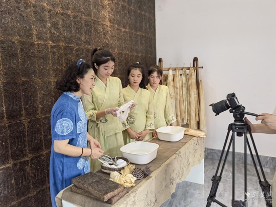 趙愛新(左一)帶領(lǐng)學(xué)生在羊樓洞古鎮(zhèn)現(xiàn)場制作茶染作品。通訊員 供圖