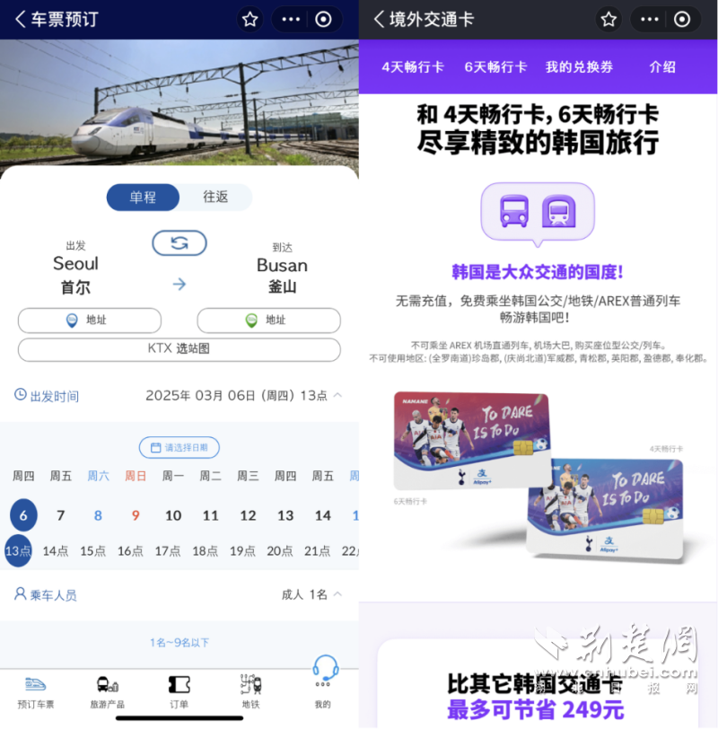 赴韓游客上支付寶可查詢韓國火車的車次并選座買票,還能買更實惠的暢行交通卡。通訊員供圖