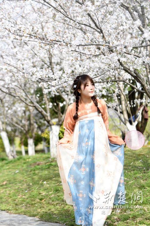 堤角公園園內(nèi)不少身著漢服、帶齊拍攝裝備的博主前來打卡拍照,將賞花美圖發(fā)布在社交平臺(tái)上,帶火“賞櫻”熱度。通訊員供圖