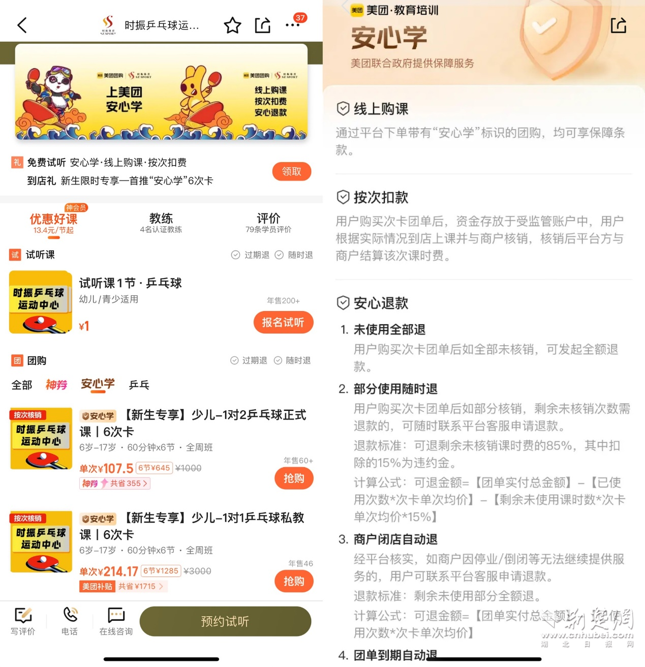 荊楚網(wǎng)(湖北日?qǐng)?bào)網(wǎng))訊(通訊員 雋蒙)“上一次課,核銷一次款項(xiàng)”的次卡團(tuán)購,正成為越來越多教育培訓(xùn)機(jī)構(gòu)的轉(zhuǎn)型新方向。美團(tuán)最新消息顯示,主打“一課一銷”的“安心學(xué)”次卡產(chǎn)品已面向全國鋪開,截至3月10日,全國100多城的上萬家教培機(jī)構(gòu)報(bào)名參與,課程數(shù)量超15000門。
