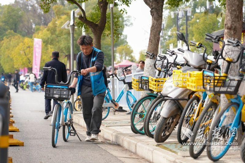 “你好,請(qǐng)往這邊有序停車。前行200米就是櫻園大門,那邊不好停車?!痹隰斈ヂ窋埓渫\噲?chǎng)附近,單車運(yùn)維人員正在引導(dǎo)騎行游客前往指定區(qū)域停放單車。