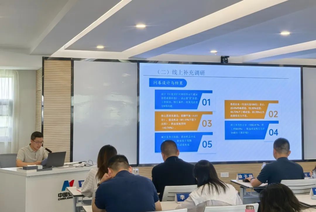 “以新需求為導(dǎo)向,打造‘區(qū)級(jí)核心商圈+街區(qū)融合中心+社區(qū)特色網(wǎng)點(diǎn)’三級(jí)聯(lián)動(dòng)商業(yè)布局,全面提升居民的生活品質(zhì)?!薄皩⒖萍汲晒D(zhuǎn)化、團(tuán)隊(duì)培養(yǎng)等指標(biāo)納入A、B和C類人才動(dòng)態(tài)評(píng)價(jià)體系,探索‘區(qū)內(nèi)貢獻(xiàn)’與‘(人才)住房資源’的權(quán)重平衡機(jī)制”。結(jié)業(yè)式上,五組學(xué)員代表分別圍繞城市更新、AI技術(shù)賦能產(chǎn)業(yè)轉(zhuǎn)型、發(fā)展現(xiàn)代服務(wù)業(yè)體系、都市近郊農(nóng)業(yè)發(fā)展路徑探索和打造人才“引育留用”服務(wù)體系等主題,詳細(xì)匯報(bào)了本組調(diào)研成果,對(duì)相關(guān)領(lǐng)域存在的問(wèn)題進(jìn)行深入剖析,提出了一些有借鑒意義的思考建議。