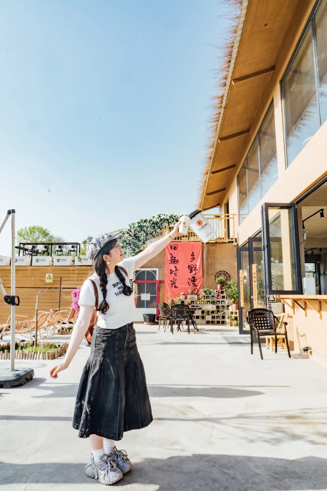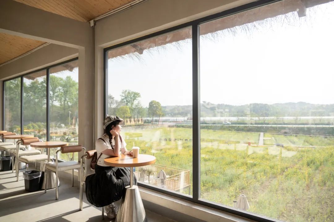 靠窗的吧臺(tái)也十分吃香,時(shí)不時(shí)有年輕的女孩端起咖啡,輪番坐上吧臺(tái)椅拍照,背景是屋外的稻田與花海,非?!俺銎?。
