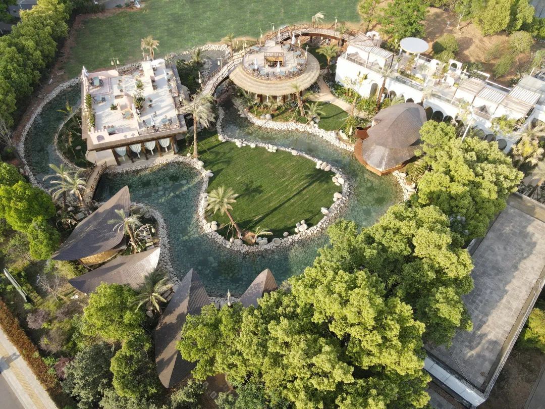 白丁藝術島坐落于武漢國際體育文化休閑園內,總占地面積近4000m2。踏進這座蘊含東南亞風情的神秘小島,組合式藝術空間藏在繁茂的熱帶植物中,近200米長的生態(tài)水系蜿蜒貫穿,法式南洋風情藝術空間群由連廊貫通,筆直的中東海藻、加那利海棗高大挺拔。