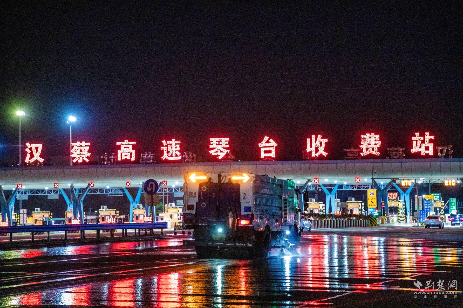 29日夜晚11時許,在漢陽漢蔡高速進(jìn)出城口,高壓清洗車、吸掃車、隔音屏清洗車等10余臺機(jī)械作業(yè)裝備待發(fā)。