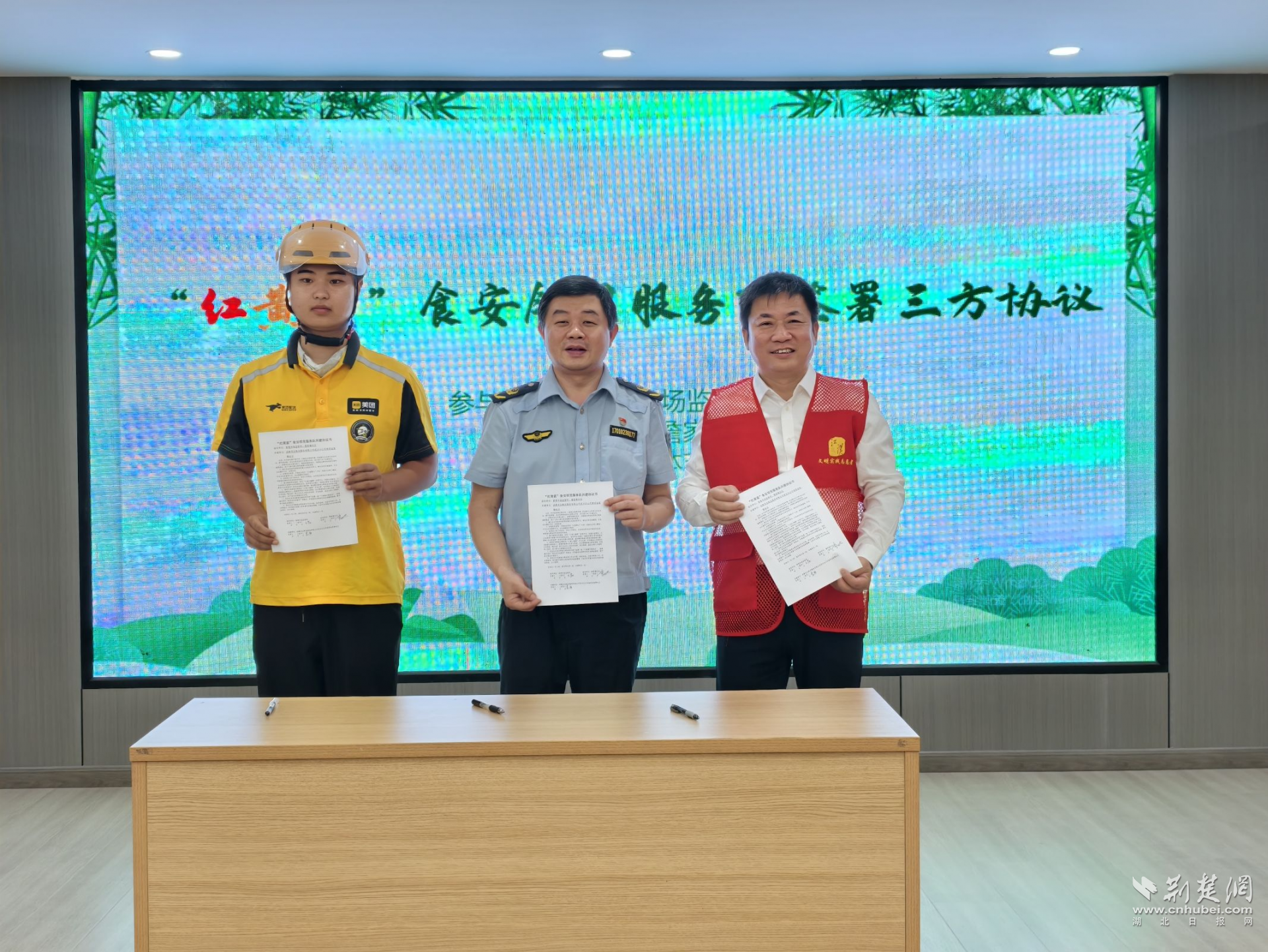 在簽約環(huán)節(jié),“紅黃藍(lán)”食安鄰里服務(wù)隊(duì)正式簽署“食安守護(hù)”共建協(xié)議,并發(fā)布食品安全倡議書(shū)?,F(xiàn)場(chǎng)還向騎手代表送上端午禮包,鼓勵(lì)他們發(fā)揮職業(yè)優(yōu)勢(shì),化身食品安全“移動(dòng)哨兵”。