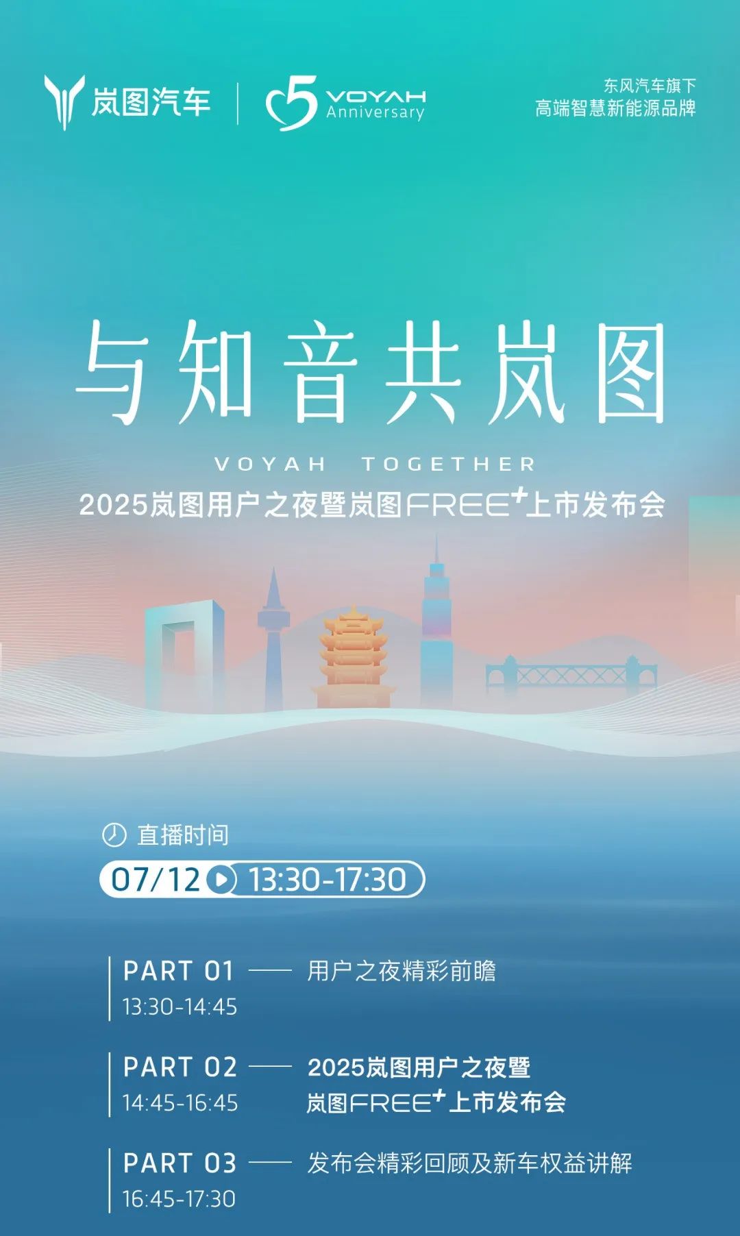 7月12日,2025嵐圖用戶之夜活動(dòng)將在武漢經(jīng)開(kāi)區(qū)舉行。屆時(shí),5000多位嵐圖用戶代表將齊聚車(chē)谷,備受期待的嵐圖FREE+將正式上市,全新嵐圖知音也將煥新亮相。