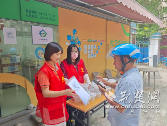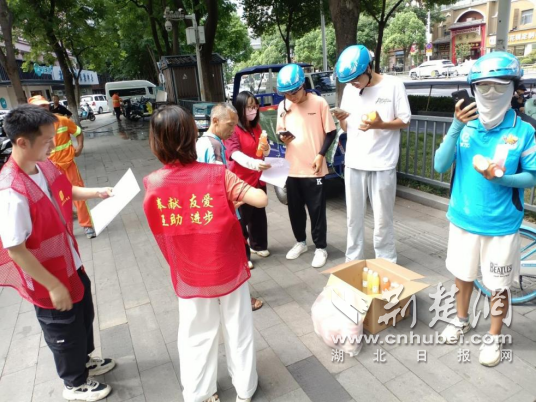 “師傅,喝瓶冰水,記得防暑啊。”活動現(xiàn)場,紅馬甲志愿者將冰鎮(zhèn)礦泉水、藿香正氣液、降溫貼等防暑用品一一遞到外賣員、快遞小哥和環(huán)衛(wèi)工人手中。為了照顧騎手等餐時間短、流動頻繁的特點,社區(qū)提前將綠豆湯和糕點送至暖新驛站,實現(xiàn)“人找貨”變“貨找人”,當天共為50多位戶外勞動者送上了這份貼心清涼。
