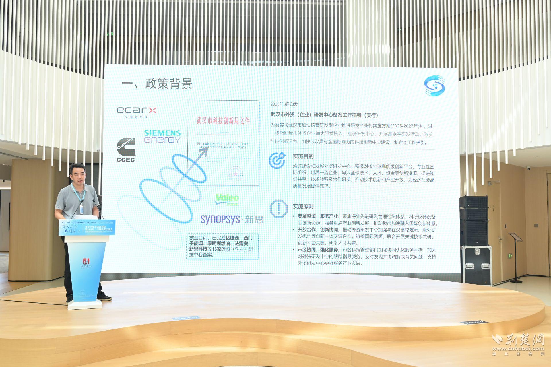 活動(dòng)上,武漢市投促局副局長(zhǎng)隋鵬發(fā)表致辭,推介武漢外資發(fā)展情況,傳遞了武漢堅(jiān)定不移優(yōu)化營(yíng)商環(huán)境、支持外資企業(yè)發(fā)展的決心與誠(chéng)意。中國(guó)人民銀行湖北省分行介紹了武漢市“科匯通”試點(diǎn)業(yè)務(wù),武漢作為“科匯通”16個(gè)試點(diǎn)城市之一,為科研資金跨境調(diào)撥提供“綠色通道”,推動(dòng)創(chuàng)新要素跨境流通。市科技創(chuàng)新局圍繞武漢科技研發(fā)政策進(jìn)行詳細(xì)解讀,激勵(lì)引導(dǎo)外資企業(yè)逐高向新,開(kāi)展高水平研發(fā)活動(dòng)。武創(chuàng)院介紹了機(jī)構(gòu)運(yùn)行情況,表示將以創(chuàng)新體系建設(shè)為抓手,以市場(chǎng)化機(jī)制為手段,探索多元化成果轉(zhuǎn)化創(chuàng)新舉措,集聚“政產(chǎn)學(xué)研金服用”各類(lèi)要素資源,營(yíng)造“熱帶雨林式”成果轉(zhuǎn)化創(chuàng)新生態(tài)。武漢東湖高新區(qū)同步進(jìn)行了招商推介,展現(xiàn)了中國(guó)光谷科技創(chuàng)新硬實(shí)力。·