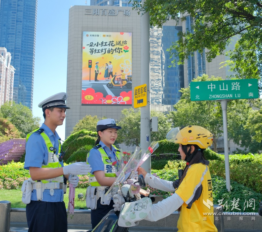 荊楚網(湖北日報網)訊(通訊員小雨)8月29日七夕當天,美團在西寧、鄭州、蘭州、深圳、武漢等全國16座城市同步發(fā)起“送你一朵小紅花”交通安全倡導行動。各城市交警在十字路口、斑馬線前為遵守交通規(guī)則的騎手和市民送上鮮花及反光貼紙,傳遞“安全出行”理念?;顒蝇F(xiàn)場,近萬人領取到倡導交通安全文明的“小紅花”。據(jù)了解,這是美團在全國發(fā)起的騎手交通安全正向激勵系列活動之一,旨在推動騎手交通安全意識提升與權益保障的常態(tài)化。