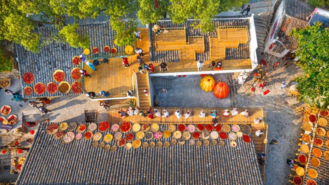 【豐收調(diào)色盤】登高遠(yuǎn)眺,整個(gè)古村宛如打翻的調(diào)色盤。辣椒紅、玉米黃、南瓜橙...在青瓦飛檐間鋪展成壯觀的豐收?qǐng)D卷。最佳攝影點(diǎn)已就位,等您收錄今秋最動(dòng)人的畫。