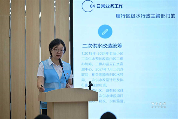 活動開場,武昌區(qū)水資源管理服務(wù)中心主任周妍圍繞《武昌區(qū)水務(wù)和湖泊局及水資源管理中心工作職責》展開解讀,清晰梳理水務(wù)部門在水資源調(diào)配、供水保障、設(shè)施維護等方面的職能;同時深入講解二次供水改造及修繕現(xiàn)行政策,從改造標準、申請流程到惠民福利逐一剖析,讓居民明晰這項民生舉措。